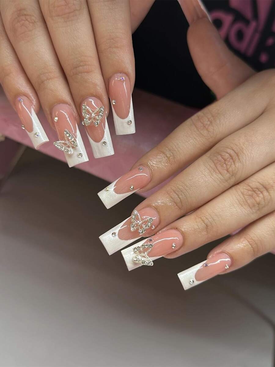 Faux ongles Y2K rose French léopard avec strass ,Un style Y2K audacieux et tendance