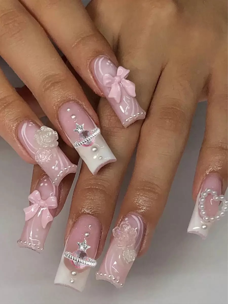 Le design rose avec pointe French et imprimé léopard mélange élégance et audace pour un rendu moderne et stylé. Les décorations en strass cœur, nœuds, notes de musique et motifs tendance ajoutent une touche fun et glamour à votre manucure.